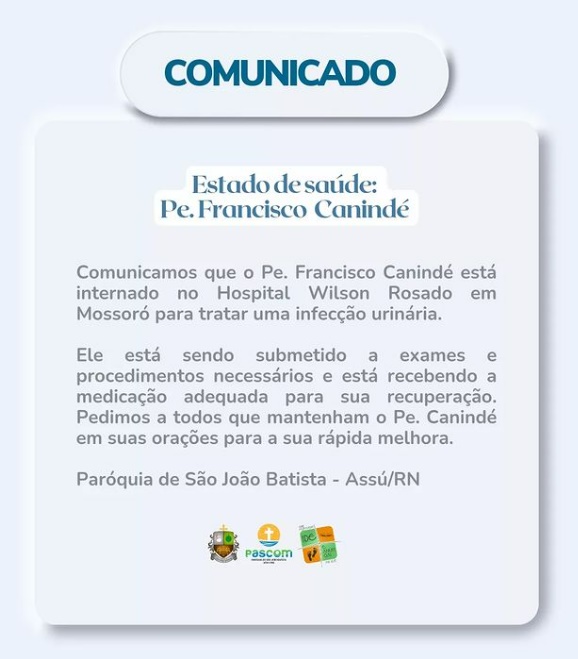 Segundo o comunicado publicado no perfil oficial da paróquia no Instagram, o sacerdote católico “está internado no Hospital Wilson Rosado em Mossoró para tratar uma infecção urinária”.