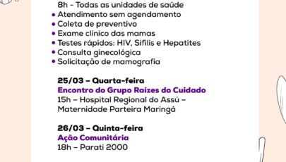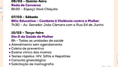 Nas 16 Unidades Básicas de Saúde do município, as mulheres podem buscar coleta de preventivo, exame clínico das mamas, testes rápidos de HIV, sífilis e hepatites, além de consulta ginecológica, tudo sem agendamento, em livre demanda. Dois “Dias D” concentram essas ações: 10 e 24 de março em todas as UBS.